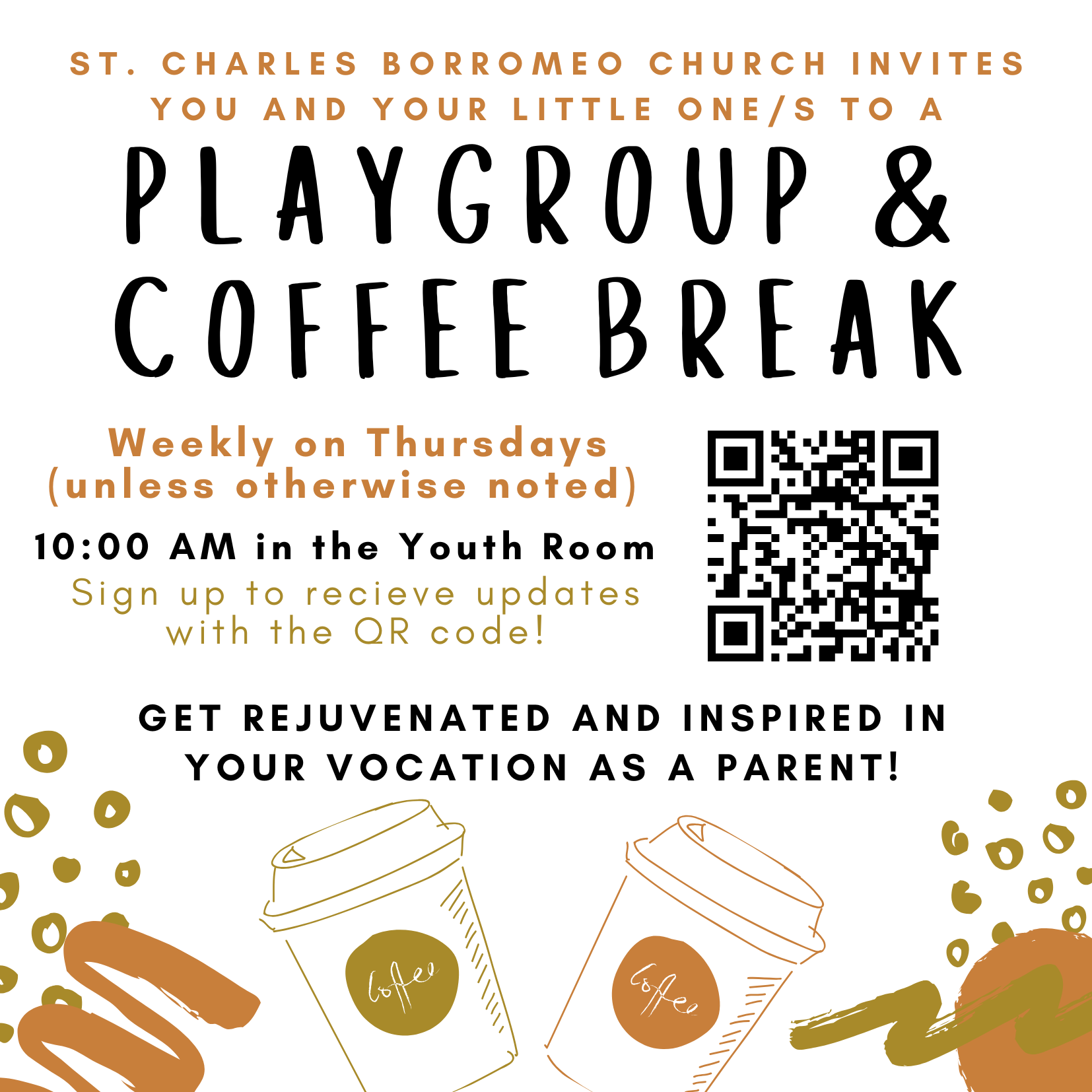 The parish and school of St Charles warmly invite you and your little one(s) to a playgroup and coffee break weekly on Thursday mornings at 10:00 AM. We usually meet in the Youth Room of the church. Sign up here to receive email updates. Get rejuvenated and inspired in your vocation as a parent! More info here.